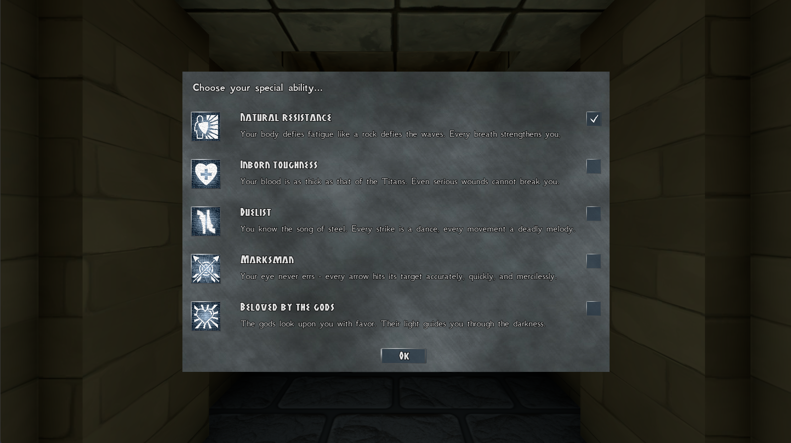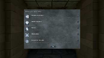 Skills learned through found items (e.g. a shield enables the skill shield bash) or through completed deeds, because gods reward or punish the deeds of humans. - Survive the hardship